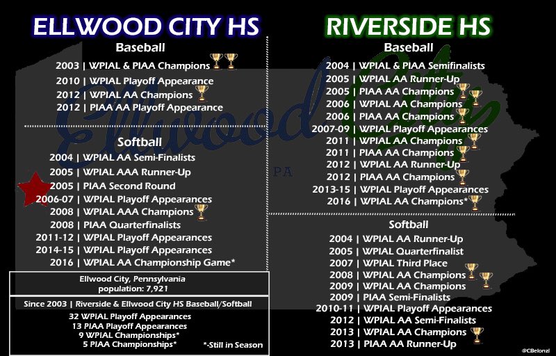 This spring I’ve had the pleasure to be a journalist in a town with two WIAL championship teams: Riverside baseball and Ellwood softball. In fact, since 2001, these two schools have collected an impressive amount of combined titles* through their four varsity ball teams.