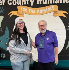 For the fourth year the club matched a “spare change challenge” matching a members change collected through the year and donated it to the Beaver County Humane Society. Pictured are King Lion Chip and a Beaver County Humane Society employee Ariana.
