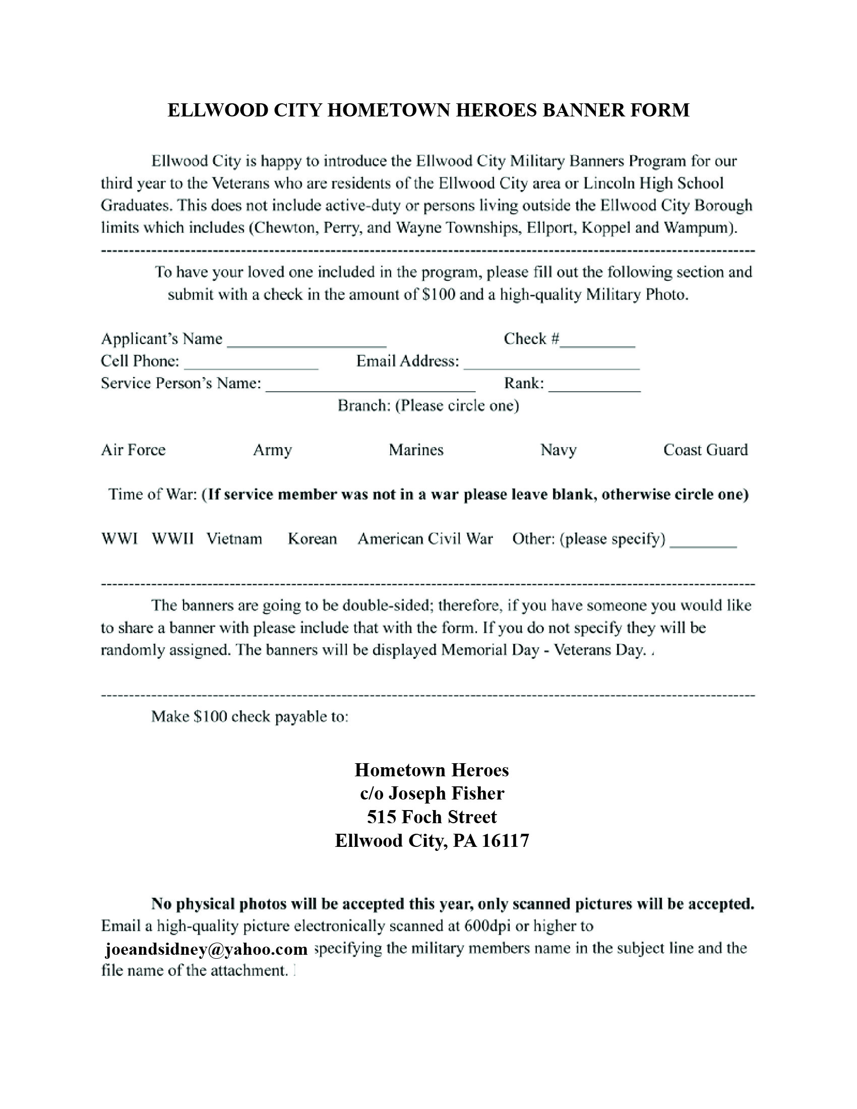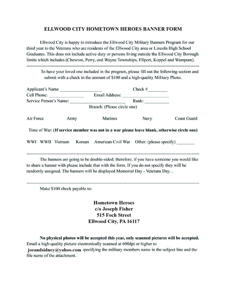 You can now submit your information through Monday, May 5th to have a banner proudly displayed around Ellwood City as part of this initiative.