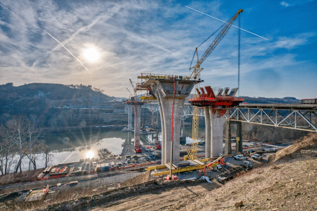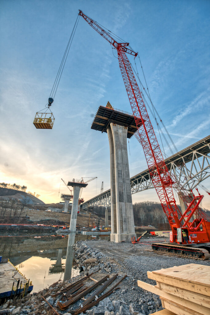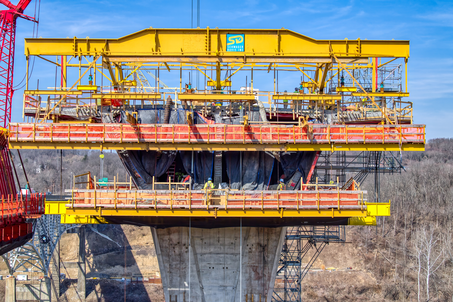 Pier tables are currently under construction on the eastbound bridge and have been completed on the westbound side. Each bridge is a five-span, cast-in-place, segmental bridge that is 1,645 feet long and 200 feet high. The westbound bridge structure is anticipated to open in mid-2026 with the entire project finished in 2027.