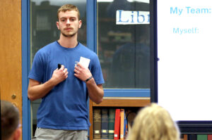 Austin Haley, a Riverside High School senior, presents his business plan Monday, May 5, 2025, in Lincoln’s library in Ellwood City as the Riv-Ell Entrepreneurship program’s capstone project. Riv-Ell is a Butler County Community College high school program whose graduates earn 16 credits and BC3’s workplace certificate in entrepreneurship.