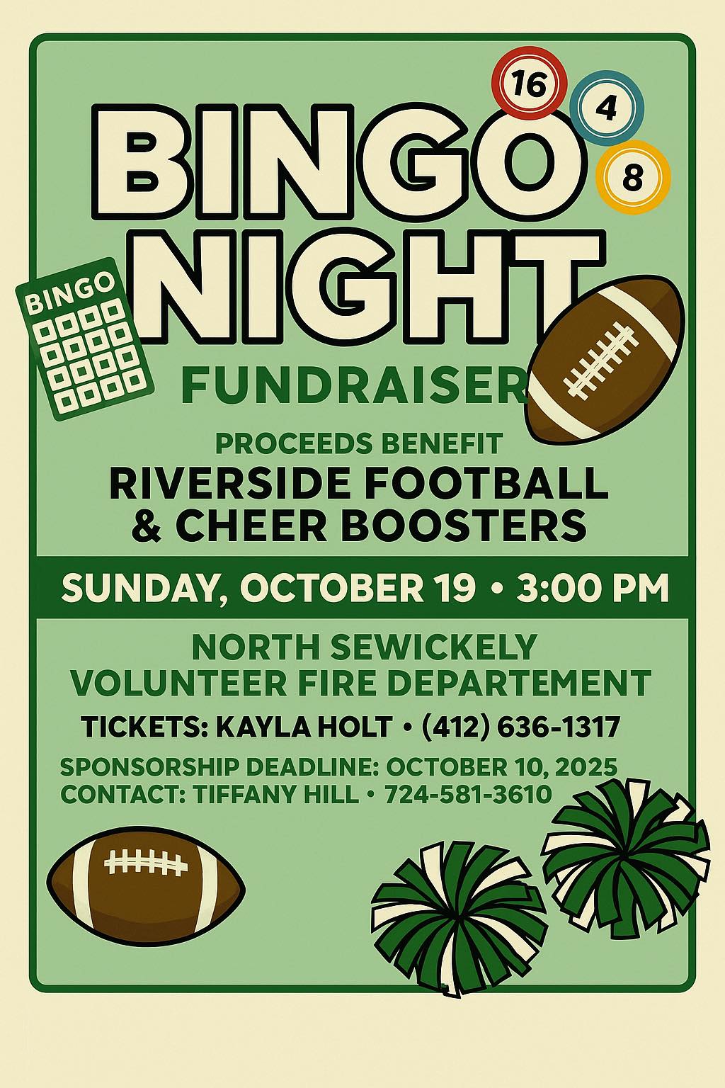 Be the first to comment on "Riverside Football & Cheerleaders Hosting Joint BINGO Night Fundraiser"