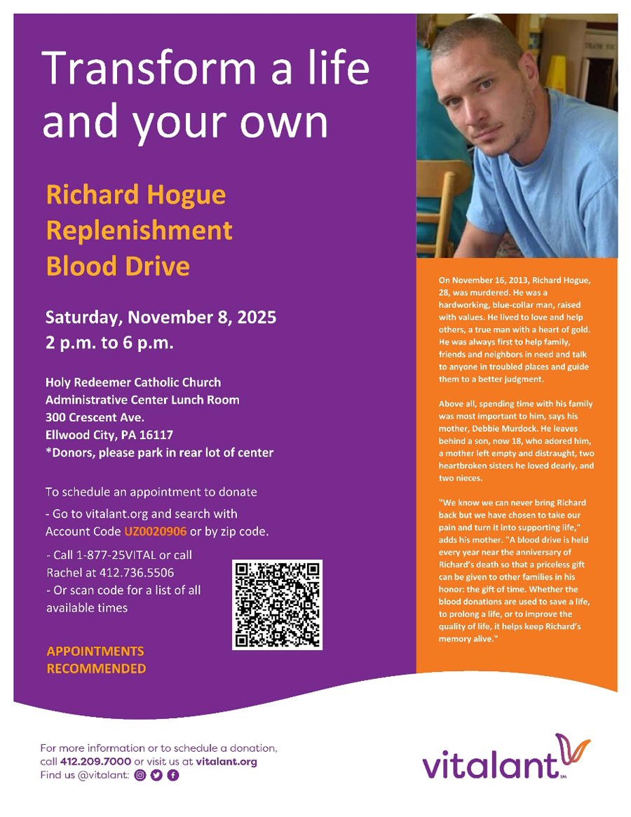 The blood drive will be held from 2:00 p.m. to 6:00 p.m. at the Holy Redeemer Catholic Center Administrative Center Lunch Room, 300 Crescent Avenue, Ellwood City, PA 16117. Donors are asked to park in the rear lot of the center
