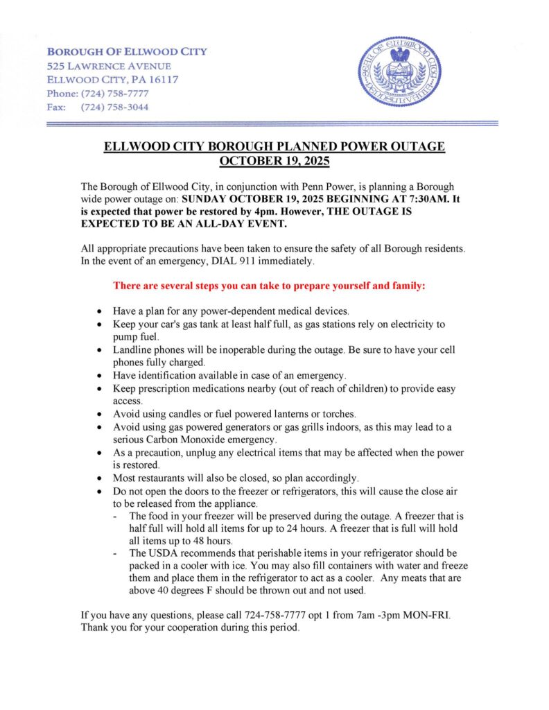 Ellwood City Borough has announced a planned power outage for October 19, 2025, so that Penn Power can perform maintenance and repairs to a main line that comes into the borough.