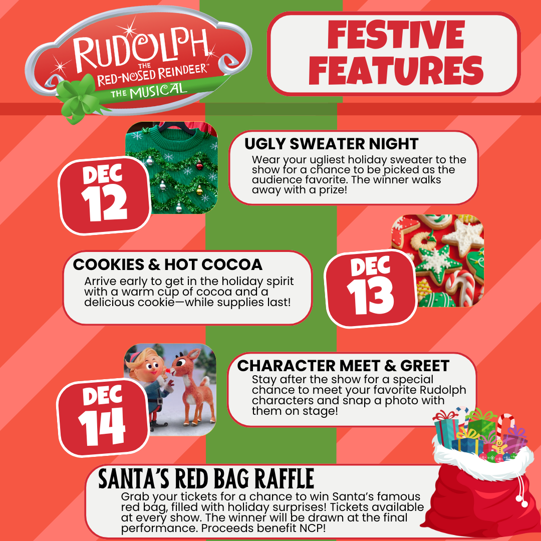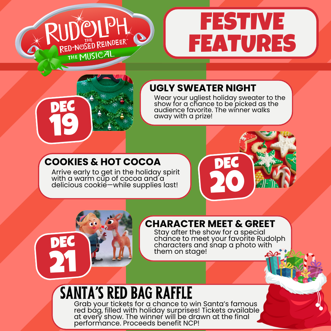 Patrons can also explore the holiday gift shop and enter Santa’s Red Bag Grand Raffle, featuring over $500 in gift cards. Raffle tickets are available at each performance.